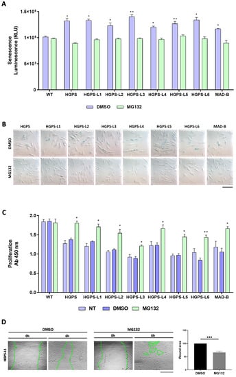 Primary fibroblasts from HGPS patients exhibit proliferative defects []. To determine whether MG132-induced clearance of progerin has any beneficial effects on cell proliferation, we examined the proliferation rates of HGPS-like fibroblasts with MG132 or DMSO treatment and found that in all the tested cell lines, proliferation rates were increased by a 96 h MG132 treatment at 500 nM when compared to the DMSO-treated cells (Figure 3C). As in HGPS [], nuclear architecture and cell migration are impaired during physiological aging []. We investigated the effect of MG132 treatment on cell migration. “Wound-healing” assays showed that most of the MG132-treated HGPS-like and MAD-B cells (6/8) were able to migrate and to “heal the wounds” better than their control DMSO-treated counterparts (Figure 3D and Figure S1).