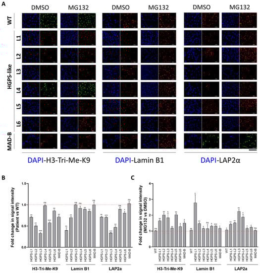 Other characteristics of fibroblasts from individuals with HGPS cells include a loss of peripheral heterochromatin and downregulated tri-methyl lysine 9 of core histone H3 (H3-Tri-Me-K9) [,] as well as reduced levels of the nuclear components, lamin B1, and lamina-associated polypeptide (LAP2α) [,]. By immunocytochemistry studies, as observed in Figure 4A and Figure S2 (larger images), levels of these proteins are also reduced in HGPS-like and MAD-B cells compared to WT (Figure 4B), supporting a negative correlation between aberrant prelamin A accumulation and the downregulation of several nuclear proteins, including histone modification patterns. Importantly, treatment with MG132 restored the levels of histone H3-Tri-Me-K9, lamin B1, and LAP2α in most cells (Figure 4C).