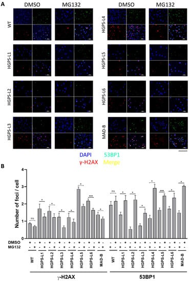 Previous studies have shown that HGPS cells accumulate a defective DNA damage response (DDR), playing a key role in the premature aging phenotypes [,]. Progerin causes chromatin perturbations, especially the global loss of histone H3-Tri-Me-K9, leading to the formation of DSBs (double-strand breaks) and abnormal DDR, as evidenced by the accumulation of phosphorylated histone γ-H2AX foci and the impaired recruitment of p53-binding protein 1 (53BP1) to sites of DNA damage [,]. We performed γ-H2AX/53BP1 double immunofluorescence staining and observed more γ-H2AX-positive foci in HGPS-like and MAD-B cells than those observed in control, with defective recruitment of 53BP1 to these sites (Figure 5A and Figure S3: larger images). However, MG132 treatment reduced the number of nuclei with γ-H2AX foci. Moreover, we observed a more effective recruitment of 53BP1 to the remaining γ-H2AX foci (Figure 5B).