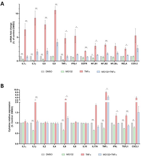 Anti-inflammatory effects of MG132 in HGPS-like and MAD-B cells. (A) Quantitative real-time PCR using selected inflammatory genes expression arrays in culture supernatants of HGPS, HGPS-like, and MAD-B fibroblasts treated for 6 h with MG132 (500 nM), TNFα (10 ng/mL) alone and in combination, or DMSO as vehicle control. The results of individual samples (Figure S5) were grouped into biological replicates (1 HGPS, 6 HGPS-like, and 1 MAD-B) to perform statistical tests. (mean ± SEM, n = 8, Student’s t-test, * p < 0.05, *** p < 0.001; MG132-treated vs. DMSO-treated cells and MG132+TNFα-treated vs. MG132-treated cells). (B) Enzyme-linked immunosorbent assay (ELISA) using multi-analyte ELISA arrays to measure inflammatory cytokines in culture supernatants from HGPS, HGPS-like, and MAD-B fibroblasts treated for 24 h with MG132 (500 nM), TNFα (10 ng/mL) alone and in combination, or DMSO as vehicle control. The results of individual samples (Figure S6) were grouped into biological replicates (1 HGPS, 6 HGPS-like, and 1 MAD-B) to perform statistical tests. (mean ± SEM, n = 8, Student’s t-test, * p < 0.05, ** p < 0.01, *** p < 0.001; MG132-treated vs. DMSO-treated cells and MG132+TNFα-treated vs. MG132-treated cells).