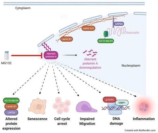 Schema summarizing the results of the current study. MG132 reduces the transcript levels of the aberrant prelamin A isoforms and the corresponding proteins already expressed. MG132 treatment improves several pathological parameters, including altered protein expression, cellular senescence, cell cycle arrest, impaired migration, DNA damage, as well as inflammatory cytokine expression.