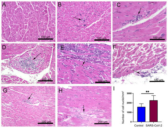 Myocardial lesions are present in the left ventricular cardiac tissue of severe acute respiratory syndrome coronavirus 2 (SARS-CoV-2) infected monkeys. Four adult-aged African green monkeys (AGMs) and four rhesus macaques (RMs) were inoculated with the SARS-CoV-2 virus (day 0) and observed for up to 28 days at the time of necropsy. Healthy monkey hearts (n = 8) were used for control. Representative microscopy images show hematoxylin and eosin staining in (A) control and (B–H) SARS-CoV-2 infected hearts (the blue color represents nuclei). (B,C,E) Varying degree of focal mononuclear infiltrates of inflammatory cells with and without necrosis were localized in the interstitium (arrows). (F) Focal lymphocytic cells were detected in the pericardium (arrow). (D,G) Varying degrees of perivascular inflammation manifested in infected monkeys (arrows). (H) Myocardial inflammatory cells were associated with areas of tissue degeneration (arrow). (I) The graph shows quantification of cellular nuclei in control and SARS-CoV-2 infected hearts (**, p-value < 0.01). Scale bars: 200 µm (D,G,H); 100 µm (A–C,E,F).