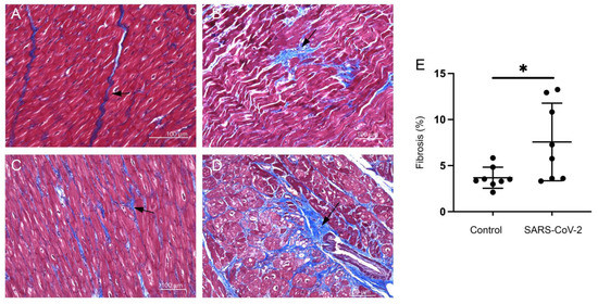 SARS-CoV-2 infected monkeys display increased areas of interstitial and perivascular fibrosis. Masson’s trichrome stain for fibrosis (blue) was done on (A) control and (B–D) SARS-CoV-2 infected hearts. Images show cardiomyocyte disarray and infiltration of fibrotic cells in the left ventricular tissue (B), interstitial fibrosis (C), and perivascular fibrosis (D). (E) The graph shows quantitation of fibrotic areas in control and SARS-CoV-2 infected hearts (*, p-value < 0.05). Horizontal bars represent mean ± standard deviation (SD). Arrows indicate areas of fibrosis in all figures. Scale bar: 100 µm (A–D).