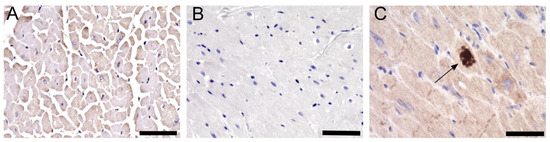 Recent publications showed that SARS-CoV-2 can be detected in the myocardium of infected patients [20,21]. Therefore, the presence of viral infection in the myocardium of SARS-CoV-2 infected primates was investigated using SARS-CoV-2 nucleoprotein antibody. Bright-field microscopy showed the presence of viral protein in the left ventricular myocardium of all eight samples (Figure 4A–C).