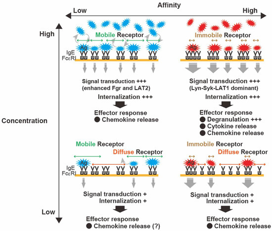 Those studies were performed using concentration- and valency-adjusted agents. The Ag properties and their interactions with IgE are important for determining FcεRI dynamics and the initiation of subsequent cellular reactions, as discussed below in Section 2.3.