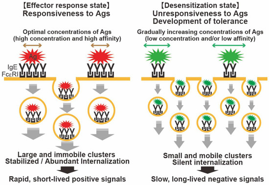 Taken together, these data reviewed above indicate that specific features of FcεRI dynamics appear to be involved in FcεRI desensitization in MCs. With therapeutic interventions based on FcεRI desensitization, ideal Ags may be those that can flexibly and generally induce small FcεRI clusters and regulate moderate FcεRI dynamics, which may contribute to the appropriate regulation of FcεRI clusters that are small and may be mobile, diffuse, and compete for internalization (Figure 2). However, one important limitation/question is whether small cluster induction and internalization, which certainly prevent rapid and robust degranulation, might induce other types of signaling or sustained/prolonged immunological responses. Indeed, the MC response shows diverse reactivity upon weak stimulation [104]. Investigating such mechanisms may lead to discoveries that influence effective desensitization and produce more reliable information. Further development of this topic might help in understanding the regulatory mechanisms involved in related therapies, which may offer insights into optimizing Ag immunotherapy and rapid desensitization strategies.