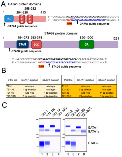 We recently reported an in vitro disease model by customizing trisomic induced pluripotent stem cells (iPSCs) using precise GATA1 gene editing to recapitulate the characteristics of TAM [15]. We utilized this model system and CRISPR (clustered regularly interspaced short palindromic repeats)/Cas9 methodology for the introduction of loss of function mutations in STAG2, representing the third genetic hit (besides trisomy 21 and GATA1s) to develop DS-ML. Hematopoietic differentiation of two distinct trisomic iPSC lines bearing GATA1 and STAG2 mutation showed that GATA1s and loss of STAG2 protein in trisomy 21 background co-operatively increased the abundance of the megakaryoid population and promoted expression of DS-ML markers. Thus, we developed an iPSC system to model the stepwise mutagenesis in DS-ML leukemogenesis using CRISPR/Cas9-mediated gene targeting.