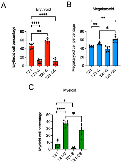 Graphs show the percentage of erythroid (A), megakaryoid (B), and myeloid (C) populations in HSPCs generated from two distinct iPSC lines with or without GATA1 and/or STAG2 mutation. Data combined from both iPSC lines performed in 3–4 independent experiments per iPSC line is plotted. Error bars indicate SD of the mean. Asterisk indicates statistical significance in indicated pair of iPSC lines, * p < 0.05, ** p < 0.01, **** p < 0.0001. Data from each iPSC line are presented in Figure S1.