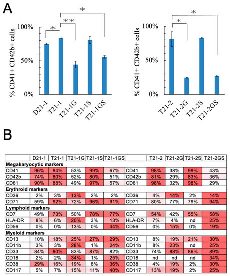 - Chou, S.T.; Opalinska, J.B.; Yao, Y.; Fernandes, M.A.; Kalota, A.; Brooks, J.S.; Choi, J.K.; Gewirtz, A.M.; Danet-Desnoyers, G.A.; Nemiroff, R.L.; et al. Trisomy 21 enhances human fetal erythro-megakaryocytic development. Blood 2008, 112, 4503–4506. [Google Scholar] [CrossRef]