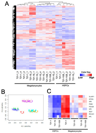 (A) Heatmap showing the unsupervised hierarchical clustering of all samples. (B) Principal component analysis of the indicated samples. T21-1 HSPCs (T_1,2 in red), T21-1G HSPCs (TG_1,2 in green), T21-1GS (TGS_1,2 in blue), T21-1 megakaryocytes (T_ME_1,2 in teal), T21-1G megakaryocytes (TG_ME_1,2 in pink), T21-1S (TS_ME_1,2 in yellow), T21-1GS (TGS_ME_1,2 in magenta). All genes were used for both analyses. (C) Heatmap showing the expression of megakaryocyte markers.