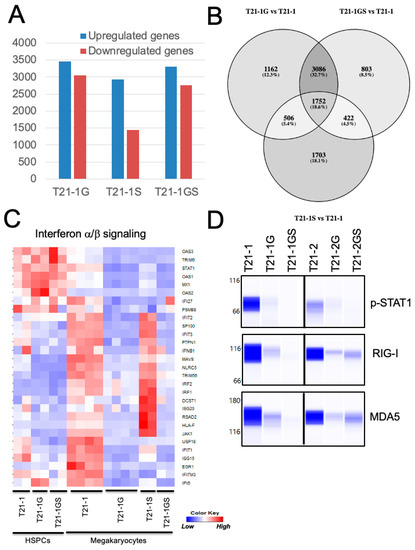 (A) Graph showing the number of differentially regulated genes (FDR < 0.05, log fold change >2 or <−2) in the indicated megakaryocytes with respect to wildtype T21-1. (B) Venn diagram of the differentially regulated genes. The shading is proportional to the percentage of shared genes. (C) Heat map showing the expression of genes belonging to the interferon α/β signaling pathway. (D) Wes immunoblot analysis of key proteins belonging to the interferon α/β signaling pathway in megakaryocytes. Total protein was quantitated using total protein analysis kit and used for normalization.