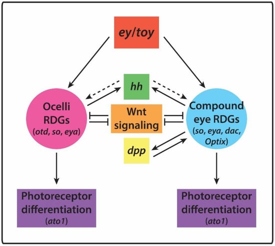 Dpp and hh are essential in the regulation of RDGs in D. melanogaster. Dpp is required for the maintenance of the morphogenetic furrow, where it activates the expression of so, eya, and dac [18]. hh activates the expression of so and eya in the compound eye and eya and otd in the ocelli [21,22].