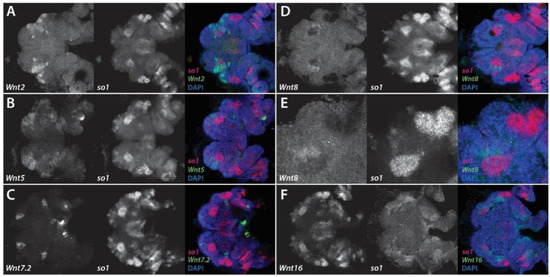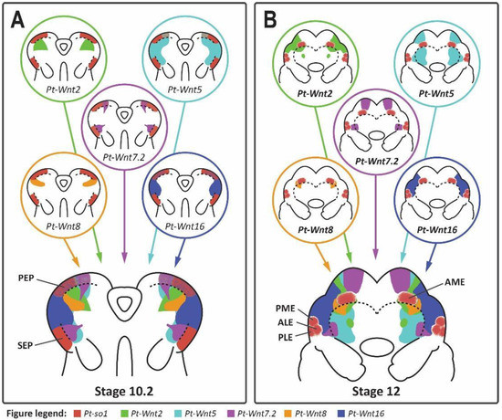 Lastly, Pt-Wnt16 expression appears to be restricted to the lateral rims of the developing head at stage 10.2 (Figure 6G). Expression appears to be immediately anterior to the secondary eye primordia, though it also seems to extend into the Pt-so1 expression domain in the principal eye primordia (Figure 6G,H). However, Pt-Wnt16 expression does not completely overlap with Pt-so1 expression in this domain (Figure 6H). Pt-Wnt16 expression at stage 12 appears to be restricted to the same area of the developing head, seemingly strongest immediately anterior to the secondary eye primordia, and no longer overlaps with Pt-so1 expression in the principal eye primordia (Figure 7F).