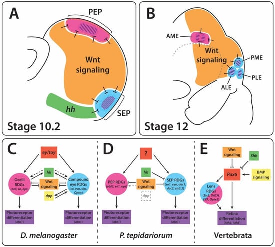Proposed gene regulatory network controlling eye development in Parasteatoda tepidariorum and comparison with insects and vertebrate RDGNs. (A) Summary of gene expression reported in this study that may regulate eye development, shown in a stage 10.2 embryo. Wnt signaling and hh suppress the expression of RDGs in the tissue surrounding the developing eye primordia. Atonal expression (purple hatching) is present in a subpopulation of cells within the eye primordia. Some Wnt expression was observed overlapping the PEP (dashed lines). (B) Summary of gene expression in a stage 12 embryo. Wnt signaling suppresses RDG expression in the eye primordia, and atonal expression is present in a subpopulation of cells at the centre of each eye. (C–E) Proposed networks regulating eye development in Drosophila melanogaster, P. tepidariorum and vertebrates. (C) In D. melanogaster, ey/toy initiate RGD networks in the ocellus (pink) and compound eye (blue) primordia. These are suppressed by Wnt signaling and reciprocally activated by hh and dpp. (D) In P. tepidariorum, Wnt, and hh suppress RDGs in the principal (pink) and secondary (blue) eye primordia, while Dpp is absent, and the upstream initiation of RDGs remains unknown. Wnt signaling could potentially activate RDGs during early eye development (grey dashed arrow). (E) In vertebrates, Pax6 initiates RDGs in the eye primordia (only one type, pink/blue), itself regulated by Wnt, Shh and BMP/Dpp signaling.