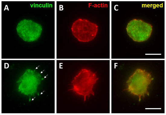 Formation of mature focal contacts in AML cells activated with TPA. THP-1 cells were seeded on fibronectin coated coverslips (10 μg/mL) n and left untreated (A–C) or were treated with TPA (30 nM for 48 h). Cells were fixed with 4% paraformaldehyde and permeabilised with 0.05% Triton X-100 and immuno-stained to detect the distribution of vinculin (A,D) and F-actin (B,E). Merged images are shown in (C,F). Vinculin was quite homogenously distributed on the surface of untreated THP-1 cells, whereas TPA activation induced the clustering of vinculin into focal contacts (arrows in D). Bar 10 μm.