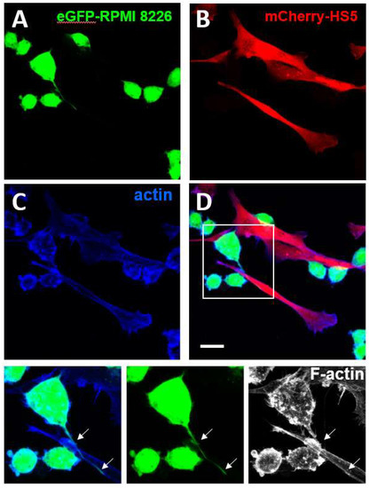 Formation of podia in multiple myeloma cells. The enhanced-Green Fluorescent Protein (eGFP)-expressing multiple myeloma cell line RPMI-8226 (eGFP_RPMI 28226) (A) and the monomeric Cherry (m-Cherry)-expressing bone marrow stromal cell line HS5 (mCherry-HS5) (B) were generated as previously described [139]. eGFP-RPMI 8226 were co-cultured for three days with mCherry-HS5 cells, fixed with 4% paraformaldehyde and permeabilised with 0.05% Triton X-100 and stained with Alexa 647-Phalloidin to detect the distribution of F-actin (C). Merged images are shown in (D). Magnification of the boxed areas with eGFP and F-actin staining are shown at the bottom. eGFP-RPMI 8226 cells formed podia (white arrows) elongating along the surface of mCherry-HS5 cells. Bar 10 μm.