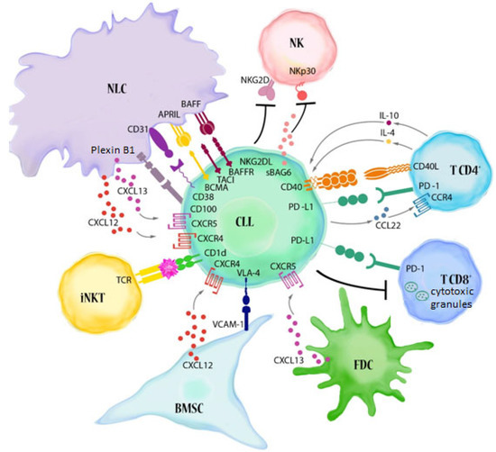 Major immune alterations in CLL. The reciprocal interactions between CLL cells and cellular elements of the immune system contribute to the building of a microenvironment that favours tumour progression. Leukaemic B lymphocytes make contact with BMSC (bone marrow stromal cells), FDC (follicular dendritic cells) and NLCs (nurse-like cells, lymphoma-associated macrophages) through adhesive molecules present on their surface (e.g., VLA-4 (CD49d)) and chemokine receptors (CXCR4 and CXCR5). These interactions, together with BCR activation, promote the survival, proliferation and migration of CLL cells. NLCs, which show phenotypic features similar to M2-like tumour-associated macrophages (TAM), express TNF family molecules: BAFF (B cell activating factor) and APRIL (A proliferation-inducing ligand) which support the survival of leukaemic B lymphocytes (BAFF binds to the BAFF-R, BCMA (B cell maturation antigen) and TACI (transmembrane activator and CAML interactor) receptors, while APRIL binds only the last two receptors) [15,22,25]. The CD31 molecules present on NLCs are ligands for the CD38 found on leukaemic B lymphocytes. Their interaction induces proliferation and prolongs the survival of CD38-positive lymphocytes [15]. A similar effect is caused by the interaction of plexin 1 with the CD100 present on CLL cells. NLCs share the ability to express plexin B1 with BMSC, FDC and activated T lymphocytes [26]. The interaction of CD40 with CD154 (CD40L) on T cells, and the IL-4 released by them, promotes the inhibition of apoptosis in leukaemic cells. Moreover, CD4+ and CD8+ T cells display high levels of exhaustion markers, including PD-1. CLL cells express high levels of PD-L1. The PD-1/PD-L1 axis favours the immune evasion of CLL cells from T cell cytotoxicity [15,27]. Several factors also contribute to reduced NK cell cytotoxicity, including the low expression of NK cell-activating receptors, such as NKp30. Moreover, soluble NKG2D ligands and soluble BAG6 (BAG cochaperone 6) can be released by CLL cells [25]. Another important element of the CLL microenvironment, namely, invariant NKT (iNKT) cells, can directly recognize the antigens presented by neoplastic lymphocytes and lead to their destruction. iNKT cells have the ability to activate and expand in response to the antigens presented by CD1d [14].