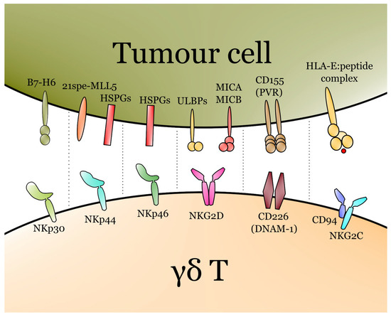 Thus, γδ T cells can be activated either directly via TCR or via one of the numerous activating receptors. Moreover, the mode of activation depends highly on the type of cancer: two types of signal, e.g., TCR + NKG2D, may be necessary in some cases [63]. Major activating receptors with their ligands are summarised in Figure 2.