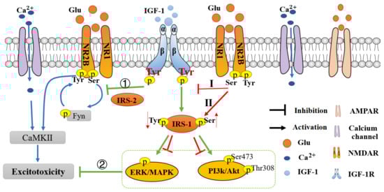 Molecular cross-talk mechanisms between glutamate and IGF-1. The green arrows indicate the mechanism of IGF-1; the red arrows indicate the mechanism of glutamate. IGF-1 inhibits glutamate-induced neurotoxicity by activating the β-subunit of IGF-1R: ① Inhibiting excitotoxicity induced by glutamate receptor subunit-induced calcium influx, through IRS-2-mediated Ser phosphorylation of NR2B; ② IRS-1 activated survival downstream MEK/ERK and PI3K/Akt signaling pathways, inhibits excitotoxicity, and confers neuroprotection. However, the overactivation of the NR2B subunit of NMDAR also inhibits the neuroprotective effect of IGF-1: I. The activation of the NR2B subunit inhibits the phosphorylation and activation of the β-subunit of IGF-1R, resulting in its uncoupling with IRS-1; II. Activation of NR2B subunit enhances IRS-1 serine phosphorylation and inhibits tyrosine phosphorylation, thereby reducing IGF-1R phosphorylation and attenuating IGF-1 survival-promoting effect.