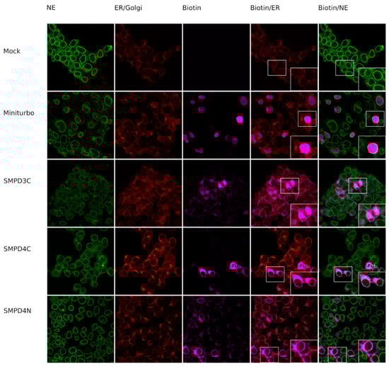 In order to study the localisation and interacting partners of SMPD4, we used a more efficient version of BioID called miniTurbo, created by Branon et al. []. This variant of BioID greatly reduces the time needed to tag proteins in its proximity with biotin, going from 24 h to less than 30 min, thus providing a more precise measurement of interaction. We created both C- and N-terminally tagged SMPD4 fusion constructs (henceforth called SMPD4C and SMPD4N), and also used the Golgi and PM localized SMPD3 [,], C-terminally fused (henceforth called SMPD3C), and a nuclear localisation signal (NLS) tagged miniTurbo construct (henceforth called miniTurbo) throughout our experiments as controls (Figure 1).