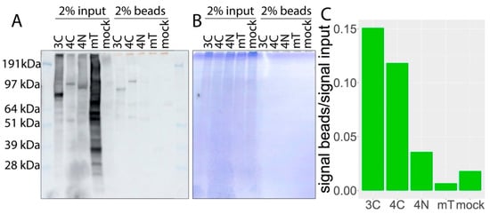 Biotinylated proteins are enriched using streptavidin-coated beads. Where 2% of cell lysates before pulldown are compared to 2% of lysates on beads after pulldown. (A) Membranes are stained with Streptavidin-HRP. Overexpressed SMPD4 bait protein constructs are self-biotinylated, and C-terminally tagged SMPD4 and N-terminally tagged SMPD4 constructs can be detected both before and after pulldown. (B) Gels after blotting. Cell lysates contain an equal amount of proteins before pulldown. After pulldown, no protein can be detected with Coomassie staining. (C) Streptavidin-HRP activity from lanes with beads is compared to activity from lanes with pre-pulldown cell lysates. SMPD3C (3C); SMPD4C (4C); SMPD4N (4N); miniTurbo (mT).