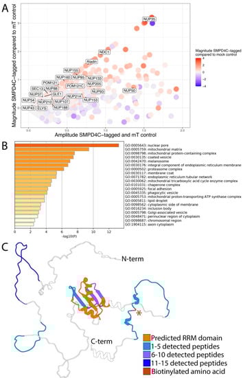 Several nuclear pore complex proteins, particularly NUP35, are enriched during pulldown after biotinylation by C-terminally tagged SMPD4. (A) The MA-plot shows the magnitude (log2 fold change) of proteins in sample 4C compared to sample mT on the y-axis, while the magnitude of proteins in sample 4C compared to the mock-treated sample is represented by the color. The x-axis represents the mean log2 emPAI signal (B) The bar plot shows the Gene Ontology analysis of proteins that were at least 1.4 (20.5) fold enriched in sample 4C compared to the mock-treated sample. Data derived from one experiment, which is also representative of the biological replicate, is shown. Figure generated on https://metascape.org (accessed on 5 February 2022). (C) Position and the number of the NUP35 peptides (biological replicate experiment) with an asterisk indicating the lysine amino acid upon which a biotin group was detected after peptide elution with organic solvents.
