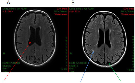 Axial FLAIR sequences. Examples of brain MRI anatomical images of cystinosis patients showing (A) an isolated ventricular dilatation (red arrow), (B) in another patient, cortical atrophy (green arrow) and diffuse white matter anomalies (blue arrow) associated with ventricular dilatation, (C–F) diffuse subcortical white matter hyperintensities, and (G,H) Wirshow or perivascular space enlargement (blue arrow)(images from N. Boddaert, Necker hospital).
