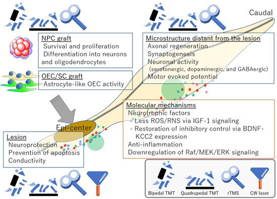 A schematic summary of the combinational effects of rehabilitation and regenerative treatment. BDNF: brain-derived neurotrophic factor; CW: continuous wave; IGF-1: insulin-like growth factor 1; KCC2: kalium-chloride cotransporter 2; OEC/SC: olfactory ensheathing cell/Schwann cell; ROS/RNS: reactive oxygen species/reactive nitrogen species; rTMS: repetitive transcranial magnetic stimulation; TMT: treadmill training.