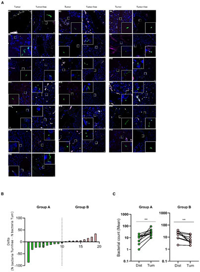 Comparison between bacterial infiltration in paired tumoral and tumor-free pan-NEN tissue. (A) Representative confocal microscopy images of the bacterial signal observed within paired tumoral and tumor-free pan-NEN patients (N = 18). Scale bar = 10 µm. (B) Bar plot representing the difference between bacteria abundance within paired tumoral and tumor-free tissue (N bacteria Tumfree-N bacteriaTum) (N = 19). (C) Comparison between the mean of bacterial count within paired tumoral and tumor-free tissue of Group A and B. Wilcoxon test was used to assess statistical significance. ** p-value < 0.05.