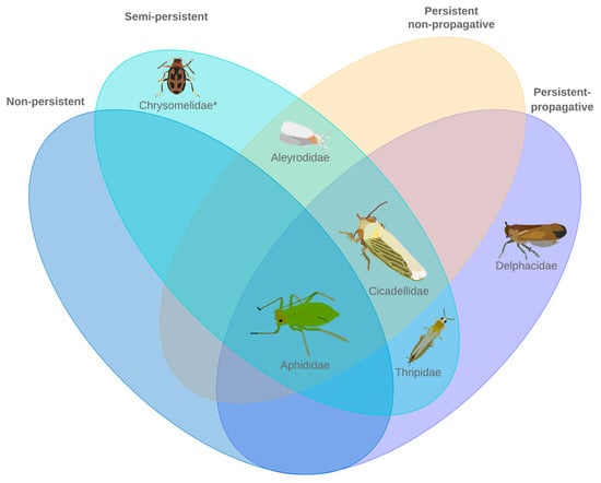 Insects belonging to the order Hemiptera and Thysanoptera transmit plant viruses in 12 (Begomovirus, Carlavirus, Closterovirus, Crinivirus, Cucumovirus, Ipomovirus, Mastrevirus, Potyvirus, Polerovirus, Phytoreovirus, Tenuivirus, and Torradovirus) and 5 (Orthotospovirus, Ilarvirus, Carmovirus, Sobemovirus, and Machlomovirus) genera, respectively [29,30,31,32]. Additionally, beetles (order Coleoptera) are also reported to transmit over 40 different plant viruses [33]. Details on the specific vector and virus taxonomic classifications from studies discussed in this review are listed in Table 1. Some viruses in the above-listed genera have been ranked in the top ten most agriculturally important plant viruses [34,35]. Plant viruses in the above-mentioned genera diversely interact with their insect vectors, and these interactions influence virus persistence within the insect [36,37,38,39,40].
