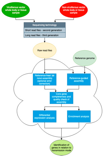 For experiments that seek to answer questions about gene regulation, the easiest way to represent how well up or downregulated a gene is to determine the differential expression profile of a viruliferous group against a non-viruliferous group of organisms. In most cases, if not all, this produces an accurate example of the expression levels. The Gene Ontology (GO) database or the Kyoto Encyclopedia of Genes and Genomes (KEGG) database can assign functions to these proteins [79,80]. Having a reference genome provides high levels of certainty as to whether a given gene of interest is up or downregulated [81]. A basic roadmap for the assembly and differential expression analysis is included in Figure 2.