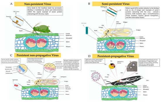 Schematic diagram explaining the interactions between plant viruses and their vectors with respect to different transmission modes viz., non-persistent, semi-persistent, persistent non-propagative, and persistent-propagative. Modeled after [29,94,95,96,107]. (A) Non-persistent viruses, such as cucumber mosaic virus (CMV), are acquired by aphids from the epidermal cells of infected plants and retained at the tip of its stylet (acrostyle) at the distal end of the common (food/salivary) duct. (B) Semi-persistent viruses, such as tomato chlorosis virus (ToCV), are phloem-limited in infected plants, and the virus attaches to the binding site at the vector’s foregut with the help of the minor capsid protein (CPm). (C) Persistent non-propagative viruses, such as tomato yellow leaf curl virus (TYLCV), are also phloem-limited and are retained in the midgut upon acquisition. Through receptor-mediated endocytosis, the virus traverses the midgut barrier into hemolymph where the endosymbiont protein GroEL interacts with the virion. The virus from the hemolymph reaches primary salivary glands mediated again via species-specific receptors. (D) Thrips acquire persistent propagative viruses, such as tomato spotted wilt virus (TSWV), from epidermal cells of infected plants. Gn/Gc protein supports virus entry into midgut cells, where replication of the virus occurs. The virus TSWV enters primary salivary glands (PSG) from MG1 through tubular salivary glands (TSG).