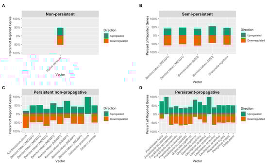 Comparison of upregulated and downregulated genes reported from studies focusing on (A) non-persistent, (B) semi-persistent, (C) persistent non-propagative, and (D) persistent-propagative transmission. Note that studies with 100% upregulation had very few genes reported due to the method chosen.
