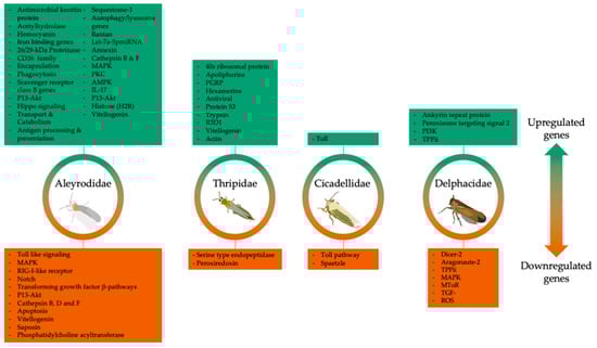 Upon the detection of the encapsulation proteins of plant viruses, a suite of vectors’ immune responses can be triggered. Below are the different immune genes and pathways that were differentially altered in vectors following the acquisition of plant viruses (Figure 5).
