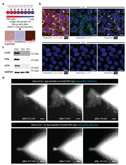 Even though we could demonstrate inducible overexpression of Cx43 protein in pluripotent cells, this was no proof for functional gap junction formation. This is a critical issue, as tagged gap junction channels were reported to show altered cell biological properties [43,44]. Therefore, we established a transgenic HeLa cell line using the construct described above to assess gap junction functionality. We chose HeLa cells because they do not express endogenous gap junction channels. WT HeLa cells were transfected with the CAG-floxSTOP-Cx43-P2A-mCherry-Ai6 construct and subsequently selected with neomycin for twelve days. Single HeLa cell clones were picked, and transgenic HeLa cell lines (Cre−) established by propagating the cells. Next, cells of a transgenic HeLa cell line (Cre−) were transduced with the AAV2.1-Cre virus, and mCherry+ HeLa colonies could be observed after three days. To establish Cx43 expressing Cre+ HeLa cell lines, we performed single cell dilution (Figure 3a). The lines were further characterized by immunostainings and Western blot analysis for Cx43, P2A, and mCherry (Figure 3b,c). We found that Cre+ HeLa cells co-expressed P2A-tagged Cx43 protein, which was localized in the cytoplasm and the cell membrane. We also observed that the Cre− transgenic control cells neither displayed mCherry fluorescence nor Cx43 or P2A expression (Figure 3b). These findings were underscored by the Western blot analysis (Figure 3c).