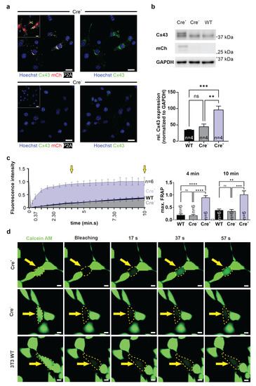 Besides HeLa cells, we also tested transfection and transduction of 3T3 mouse fibroblasts, which are known to endogenously express a low density of Cx43 gap junction channels. These experiments were performed to investigate inducible Cx43 gap junction channel formation in the presence of endogenous Cx43 gap junctions. 3T3 cells were stably transfected with the CAG-floxSTOP-Cx43-P2A-mCherry-Ai6 vector and selected with neomycin for twelve days. Through single cell dilution, a new transgenic 3T3 line was established (Cre−), as proven by PCR analysis (Supplementary Figure S3a). Cells were transduced with AAV2.1-Cre, and three days after transduction, mCherry+ 3T3 cells could be detected (Supplementary Figure S3b). Immunostainings of the Cre+ and Cre− 3T3-fibroblasts proved, as would be expected, large amounts of Cx43 and P2A (Figure 4a, upper panel) in the mCherry+ cells but no P2A and only low amounts of endogenous Cx43 in the controls (Figure 4a, lower panel). The mCherry and Cx43 overexpression in Cre+ 3T3-fibroblasts compared to control cells was confirmed by Western blot analysis (n = 4) (Figure 4b). We also studied functional Cx43 gap junction formation using fluorescence recovery after photobleaching (FRAP), which enables, in contrast to dye diffusion, quantification of the diffusion velocity of the calcein AM dye. Cells were first loaded with calcein AM, followed by the bleaching of a single fibroblast in a cell cluster using a 561 nm laser for 5 s with an intensity of 2.5 mW. Thereafter, recovery of the fluorescence intensity in the bleached fibroblast was determined every 15 s over a period of 10 min (Figure 4c,d). Our experiments showed that Cre+ 3T3-fibroblasts displayed significantly faster fluorescence recovery after photobleaching compared to Cre− cells (Tukey’s multiple comparisons test after 4 min: p(Cre− vs. Cre+) < 0.0001; after 10 min: p(Cre− vs. Cre+) = 0.0007; n = 6) and 3T3 WT cells (Tukey’s multiple comparisons test after 4 min: p(WT vs. Cre+) < 0.0001; after 10 min: p(WT vs. Cre+) = 0.001; n = 6), respectively. In contrast, WT and Cre− cells displayed very similar FRAP characteristics (Tukey’s multiple comparisons test after 4 min: p(WT vs. Cre−) = 0.9523, ns; after 10 min: p(WT vs. Cre−) = 0.9651, ns; n = 6) (Figure 4c,d; Supplementary Videos S1, S3, and S4). We also noticed that mCherry fluorescence was bleached and could not be recovered, as this protein is too big (28 kDa) to diffuse via gap junctions (Supplementary Figure S3c; n = 6, Supplementary Video S2). These experiments proved an increase in functional gap junction channels by overexpression of exogenous Cx43 in the presence of endogenous Cx43 gap junctions.