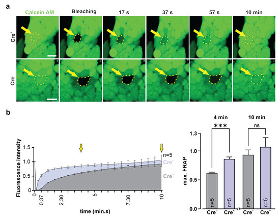 Functional gap junction formation in Cre+ G4 ES cells. Fluorescence recovery after photobleaching (FRAP) experiments in G4 ES cells. (a) Original fluorescence pictures of Cre+ and Cre− G4 ES cells after calcein AM (0.38 µM) dye loading; bleaching (for 5 s with a 561 nm laser with 2.5 mW intensity) of a single G4 ES cell of the cell cluster (bleached cell marked by a yellow dotted line and a yellow arrow); and dye recovery at 17 s, 37 s, 57 s, and 10 min after bleaching; calcein AM dye (green). Scale bars 20 µm. (b) FRAP experiments of G4 ES cells showed, 4 min after bleaching, significantly faster calcein AM dye recovery in transgenic Cre+ G4 ES cells (clone 31) than in Cre− G4 ES cells (clone 31); after 10 min, there was no significant difference in the dye recovery of both cell lines detected (quantification times are marked by yellow arrows). *** p value ≤ 0.001, ns (not significant) p value > 0.05.