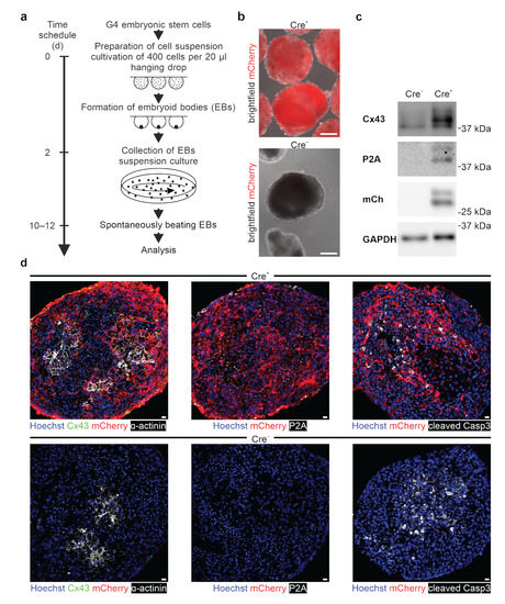 Inducible Cx43 (over-)expression in stably transfected murine G4 ES cells (clone 31), in vitro differentiation into cardiomyocytes. (a) In vitro differentiation scheme of murine ES cells into spontaneously beating EBs (adapted from Boheler et al. [33]). (b) The mCherry+ EBs derived from the transgenic Cre+ G4 ES cells of clone 31 (upper picture) and transgenic mCherry− control EBs (lower picture). Scale bars 100 µm. (c) Western blot analysis of EBs from Cre+ and Cre− G4 ES cells confirmed inducible Cx43 overexpression, as underscored by P2A-tagged Cx43 and mCherry expression. (d) Immunostainings of EBs illustrated clusters of cardiac α-actinin+ (white) cardiomyocytes in both Cre+ (upper left picture) and Cre− control EBs (lower left picture). Immunostainings yielded strong Cx43 (green, upper left picture), P2A (white), and mCherry (red) (over-)expression (upper middle picture) in Cre+ EBs. Similar apoptotic areas preferentially in the center of Cre+ and Cre− control EBs (right pictures) were found. Scale bars 10 µm.