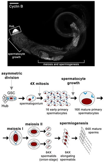 - Baker, C.C.; Gim, B.S.; Fuller, M.T. Cell type-specific translational repression of Cyclin B during meiosis in males. Development 2015, 142, 3394–3402. [Google Scholar] [CrossRef] [PubMed]