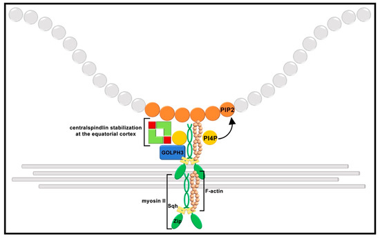 The reciprocal dependence of non-muscle myosin II and PI(4)P–GOLPH3 regulates centralspindlin stabilization at the invaginating membrane. The binding of Zip protein to Sqh is required for robust actomyosin ring formation at the cleavage furrow. The Zip–Sqh complex interacts with GOLPH3 protein and controls localization of this protein and PI(4)P (PI4P) to the cleavage furrow. In turn, GOLPH3 binds the kinesin-like protein Pav and is required for centralspindlin maintenance at the invaginating plasma membrane. The interaction of RacGAP50C with PI(4)P and PI(4,5)P2 (PIP2) also contributes to centralspindlin stabilization at the furrow plasma membrane.