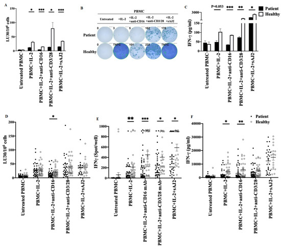 Peripheral blood mononuclear cells obtained from cancer patients exhibited lower NK cell-mediated cytotoxicity and IFN-γ secretion. PBMCs were isolated from cancer patients’ and those of the healthy individuals’ peripheral blood as described in Section 2. PBMCs were left untreated or treated with IL-2 (1000 U/mL) or with a combination of IL-2 (1000 U/mL) and anti-CD16 mAbs (3 µg/mL), or with a combination of IL-2 (1000 U/mL) and anti-CD3/28 mAbs (25 µL/mL), or with a combination of IL-2 (1000 U/mL) and sAJ2 (PBMC:sAJ2, 1:20) for 18 h before using in functional assays. NK cell-mediated cytotoxicity of PBMCs was determined using standard 4 h 51Cr release assay against OSCSCs. Lytic units (LU) 30/106 cells were determined using inverse number of PBMCs required to lyse 30% of OSCSCs × 100 (A,D). Number of cells secreting IFN-γ in PBMCs were determined as spot counts using ELISpot assay (B,E). Supernatants were harvested from PBMCs and the secretion of IFN-γ were determined using ELISA (C,F). A representative experiment is shown in (A–C) and the data are presented as Mean ± SD. Compiled data are shown in (D–E) (n = 20 to 49), and the data are presented as Mean ± SEM. Student t tests were performed. *** (p value < 0.001), ** (p value 0.001–0.01), * (p value 0.01–0.05).