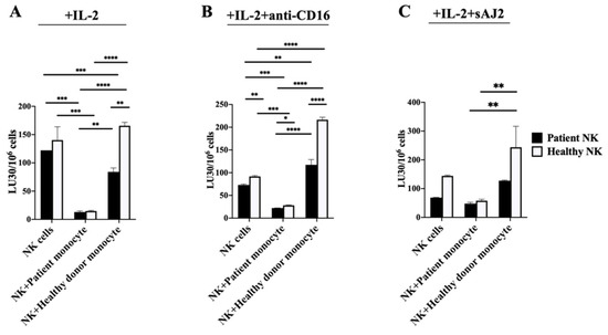 In the presence of healthy individuals’ monocytes, the cytotoxic function was increased in autologous healthy NK cells when treated with IL-2 alone (Figure 2A and Figure S2A), or IL-2 + anti-CD16 mAbs (Figure 2B and Figure S2B) or IL-2 + sAJ2 (Figure 2C and Figure S2C). However, when healthy monocytes were cocultured with cancer patients’ NK cells, the cytotoxic function of NK cells was slightly suppressed when treated with IL-2 alone (Figure 2A and Figure S2A) and was increased when treated with IL-2 + anti-CD16 mAbs (Figure 2B and Figure S2B) or IL-2 + sAJ2 (Figure 2C and Figure S2C) when compared to that of patient NK cells in the absence of monocytes. Overall, these results indicated that cancer patients’ monocytes failed to increase NK cell cytotoxicity both in patient and healthy NK cells.