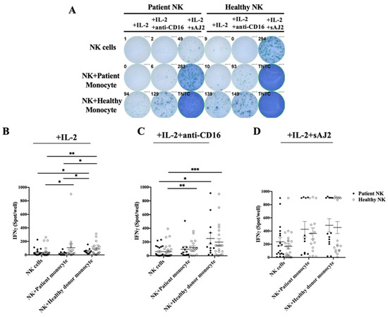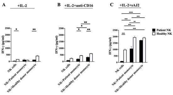 To assess cancer patients’ and healthy individuals’ monocyte-induced effect on NK cell-mediated increase in IFN-γ secretion, we cocultured autologous and allogeneic NK and monocytes and determined the number of IFN-γ spots using ELISpot assay (Figure 3 and Figure S3), and secretion using ELISA (Figure 4). In the absence of monocytes, NK cells from cancer patients exhibited suppressed IFN-γ secretion when treated with IL-2 alone (Figure 3A,B, Figure 4A and Figure S3), or IL-2 + anti-CD16 mAbs (Figure 3A,C, Figure 4B and Figure S3), but increased IFN-γ secretion in cancer patients’ NK cells were seen when treated with IL-2 + sAJ2 (Figure 3A,D, Figure 4C and Figure S3). Although the presence of both cancer patients’ and healthy individuals’ monocytes increased IFN-γ secretion, the higher increase in IFN-γ secretion was seen by healthy individuals’ monocytes cultured with both autologous and allogenic NK cells in the presence of IL-2 + anti-CD16 mAbs treatment when compared to that of IL-2 treatment alone. (Figure 3A–C and Figure 4A,B). Treatment with IL-2 + sAJ2 increased the IFN-γ secretion in both patients and healthy individuals’ NK cells. Likewise, increased levels of IFN-γ were seen when IL-2+sAJ2 treated NK cells were cultured with either cancer patients’ or healthy individuals’ monocytes (Figure 3A,D and Figure 4C). Lower IFN-γ secretion was seen in patient NK cells alone or in the presence of monocytes when secretion levels were determined using multiplex luminex assay (Table S4). Collectively, these findings indicated that cancer patients’ monocytes have lower NK activating capacity to secrete IFN-γ when compared to those from healthy individuals.
