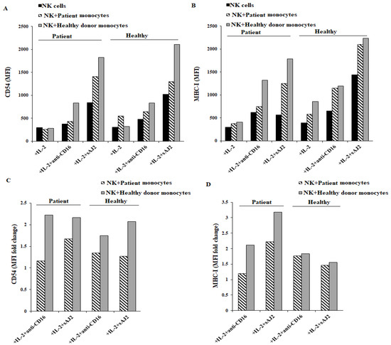 Supernatants harvested from autologous cancer patients’ NK and monocytes coculture treated with IL-2 + sAJ2 induced higher differentiation of oral squamous carcinoma stem cells (OSCSCs) in comparison to those treated with IL-2 alone or IL-2 + anti-CD16 mAbs. OSCSCs differentiation assay were conducted as described in Section 2 using supernatants collected from NK cell and monocyte coculture experiment. Surface expression of CD54 (A) and MHC-class I (B) on supernatant treated OSCSCs were determined using flow cytometry. MFI are shown in figures (A,B). MFI ratio of (Nk+monocyte/NK) for CD54 (C) and MHC-class I (D) surface expression were determined after treatment of tumor cells with supernatants collected from IL-2 + anti-CD16 mAbs or IL-2 + sAJ2-treated cells. One of two representative experiments is shown in this figure.