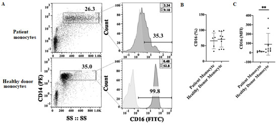 Monocytes obtained from cancer patients exhibited lower CD16 surface receptor expression. Monocytes of cancer patients (n = 5) and healthy individuals (n = 10) were isolated from PBMCs as described in Section 2. Surface expression of CD16 within CD14+ population was determined using flow cytometry. One representative experiment is shown in (A). Compiled experiments are shown in (B,C), and data are presented as Mean ± SD. Student t tests were performed to determine statistical significance. ** (p value 0.001–0.01).