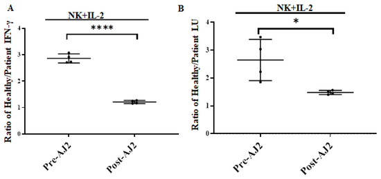 Increased IFN-γ secretion and cytotoxicity in cancer patients’ NK cells after oral AJ2 supplementation. Freshly purified NK cells (1 × 106 cells/mL) from cancer patients and those of the healthy individuals were treated with IL-2 (1000 U/mL) for 18 h before supernatants were harvested to determine IFN-γ secretion using ELISA (Pre-AJ2). Cancer patients were on oral supplementation of AJ2 for four weeks before we analyzed their NK cells. NK cells were treated with IL-2 (1000 U/mL) for 18 h before supernatants were harvested to determine IFN-γ secretion using ELISA (Post-AJ2). Ratio of secreted IFN-γ between healthy and patient NK cells were determined at pre- and post-AJ2 oral supplementation (n = 4) (A). Freshly purified NK cells (1 × 106 cells/mL) from cancer patients and those of the healthy individuals were treated with IL-2 (1000 U/mL) for 18 h before they were used as effectors in cytotoxicity against OSCSCs using standard 4 h 51Cr release assay. LUs were determined as described in Figure 2. (Pre-AJ2). Cancer patients were on oral supplementation of AJ2 for four weeks before analysis of their NK cells. NK cells were treated with IL-2 (1000 U/mL) for 18 h before they were used as effectors in cytotoxicity against OSCSCs using standard 4 h 51Cr release assay. LUs were determined as described in Figure 2. (Post-AJ2). Ratio of cytotoxicity between healthy and patient NK cell-mediated cytotoxicity were determined at pre- and post-AJ2 oral supplementation in cancer patients (n = 4) (B). **** (p value < 0.0001), * (p value 0.01–0.05).