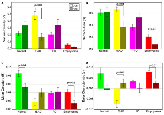 In contrast to PRM-derived fSAD, the topology of PD did not result in significant differences between groups for any of the metrics. Notwithstanding, the volume density and surface area of PRM-derived PD generated expected trends. For VPD and SPD, patients with RAS (0.34 ± 0.19 and 0.53 ± 0.18 mm−1, respectively) had higher values compared to patients with BOS (0.20 ± 0.03 (p = 0.145) and 0.36 ± 0.12 mm−1 (p = 0.091), respectively). Near identical values in mean curvature were observed between groups (BOS at 0.04 ± 0.01 mm−2 and RAS at 0.04 ± 0.03 mm−2). Although the mean value of χPD was lower in RAS (0.0003 ± 0.006) than in BOS (0.003 ± 0.001) patients, no significant difference (p = 0.132) was observed due to the large spread in values for RAS patients.