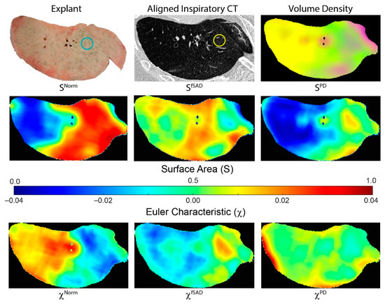 Figure 3 illustrates how tPRM metrics for individual cores depend on the location of the lung sample (core location provided on explant (blue circle) and CT scan (yellow circle)). This case is a male diagnosed with BOS 447 days post-transplant. This patient had a FEV1pp of 18% and FEV1/FVC of 0.41 when undergoing second transplantation. The distribution and arrangement of each PRM-derived classification generates topological measures that are spatially dependent on the underlying condition of the lung parenchyma. This lung section, approximately midway along the vertical axis (head to foot), comprised primarily of fSAD (yellow on volume density map) and normal parenchyma (green on volume density map). Regions with extreme values in volume density (low and high) resulted in low values of surface area (blue on surface area maps). Lung regions with a diffuse distribution of PRM classes resulted in higher values in S (red on surface area maps). This is clear for SNorm where normal lung parenchyma regionally coexists with local parenchyma classified as fSAD and PD (Figure 3 SNorm). The low values in SNorm were a consequence of that entire lung region being classified as fSAD. The Euler–Poincaré characteristic provides an indication of the dominance of any PRM class, as well as its transition to or from another PRM class. As seen for PRM-derived fSAD, χfSAD generated negative values where VfSAD was highest. Within that same lung region, χNorm had positive values, suggesting an inferior contribution to this space (red regions). These trends are consistent with the whole lung analysis for χNorm and χfSAD in the BOS group (Figure 2).