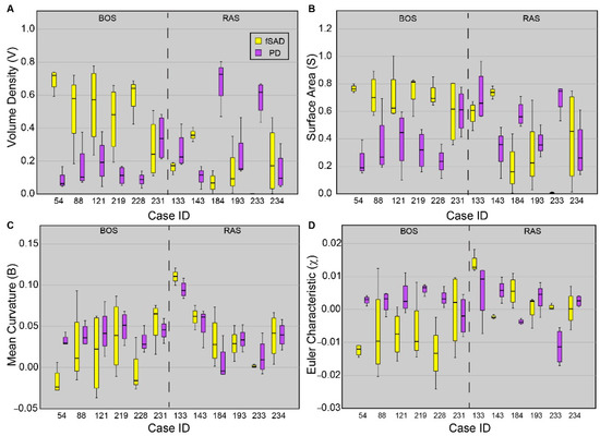 Case-specific and spatial variability in topological features within cores were evident in our study population. Between the cohorts, the lung transplant recipients diagnosed with BOS had similar topological values of volume density (V), surface area (S) and Euler–Poincaré characteristic (χ) for PRM-derived fSAD and PD. Out of the 6 BOS cases, 5 were found to have large differences in the median values over all cores per case in fSAD and PD. The cores from these cases had extensive small airways disease (VfSAD > VPD) that was highly diffuse (elevated SfSAD) and was the dominant pathology within the cores (i.e., fSAD) (negative χfSAD) (Figure 4). This is consistent with our observation over whole lungs (Figure 2), where significant differences were only observed between BOS and RAS for V, S and χ. A large range of topology values between case-specific cores was observed, as depicted by the whiskers in Figure 4. These findings suggest local variability in the distribution and arrangement of disease subtypes within individual cases.