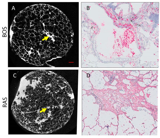 Representative microCT and immunohistochemistry for BOS ((A,B), respectively) and RAS ((C,D), respectively) cases. (A) MicroCT image of BOS core where normal airway parenchyma is seen. The arrow indicates an obliterated airway. (B) Neutrophil staining (pink) corresponds to the site of the arrow on (A). (C) MicroCT image of RAS core where some patchy fibroblast foci can be seen. (D) Collagen I stain (pink) is shown at the site of the arrow on (C). Scale bar (red line in (A)) represents 1 mm on both microCT (A,C). (B,C) were counter stained with hematoxylin (blue).